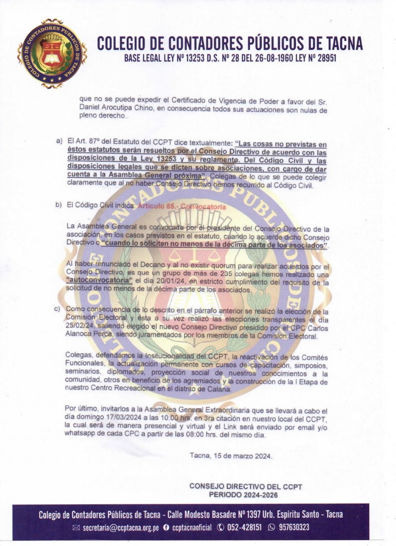 PRONUNCIAMIENTO - CONSEJO DIRECTIVO CCPT