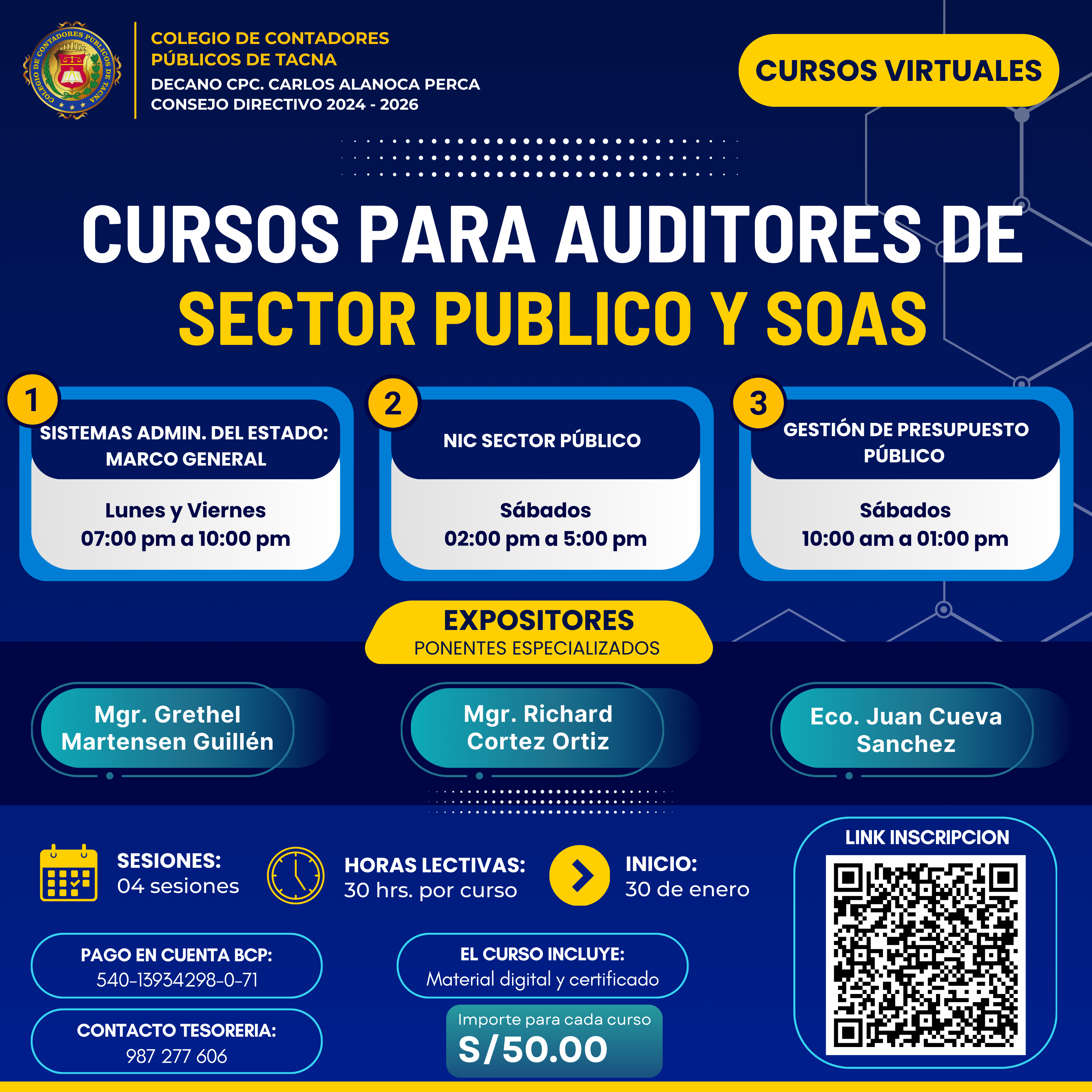 El Colegio de Contadores Públicos de Tacna, a través de su Decano CPC. Carlos Alanoca Perca y el Consejo Directivo 2024 – 2026, invita a los profesionales a participar en los siguientes cursos virtuales especializados: